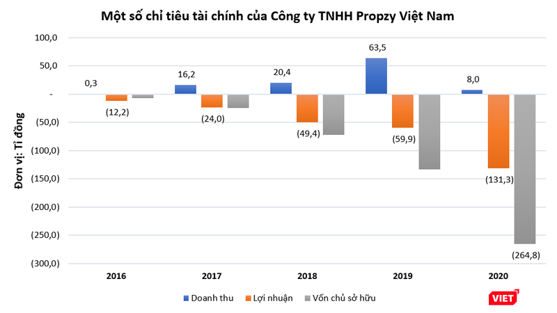 Khi đại dịch Covid-19 bùng phát, doanh thu của Propzy Việt Nam giảm mạnh, chỉ còn 8 tỉ đồng trong khi khoản lỗ ròng tăng vọt lên mức 131,3 tỉ đồng. Tới cuối năm 2020, vốn chủ sở hữu của công ty này âm 264,8 tỉ đồng.