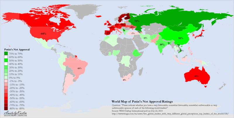 Phần lớn phần còn lại của thế giới ngoài phương Tây khá quan tâm về Putin (Mỹ Latinh, châu Phi) hoặc tiếp tục có thái độ tích cực về ông (Ấn Độ, Trung Quốc). Thực tế này một lần nữa minh chứng rằng ít nhất trên quan điểm dân số học toàn cầu, nói về việc “cô lập” Nga khỏi cộng đồng quốc tế có vẻ hoàn toàn vô nghĩa.