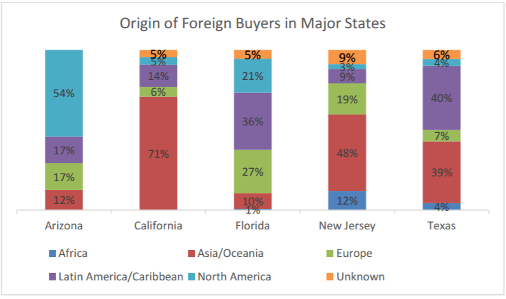Về nguồn gốc, 35% số người ngoại quốc mua nhà tại Mỹ đến từ Châu Á và Đại Dương; 24% đến từ Nam Mỹ và Caribe; 16% đến từ Châu Âu; 12% đến từ Bắc Mỹ; 4% đến từ Châu Phi và 9% không xác định.