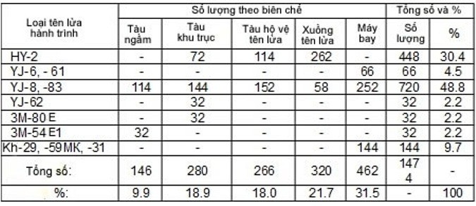 Không quân chiếm (31.5%), tàu tên lửa cao tốc hạng nhẹ chiếm (21.7%).. Các chiến hạm có lượng giãn nước lớn – khu trục hạm, tàu hộ vệ tên lửa và tàu ngầm chiếm phần còn lại trong tổng số tên lửa hành trình tấn công, riêng tàu ngầm có số lượng tương đối nhỏ (9,9%) do thực hiện nhiệm vụ chống ngầm. Một số lượng rất lớn tên lửa hành trình trên chiến hạm nổi và tàu ngầm: khoảng 88.6% (448 tên lửa hành trình "HY-2", 720 "YJ-8, -83" và 32 "3М-80E") thực hiện nhiệm vụ tác chiến tầm gần, từ 95-120 km, chỉ có khoảng 4.7% tên lửa (32 tên lửa chống tàu "3М-54E1" và 32 "YJ-62") có thể tấn công trên khoảng cách xa, đến 280-300 km chiều sâu chiến trường.
