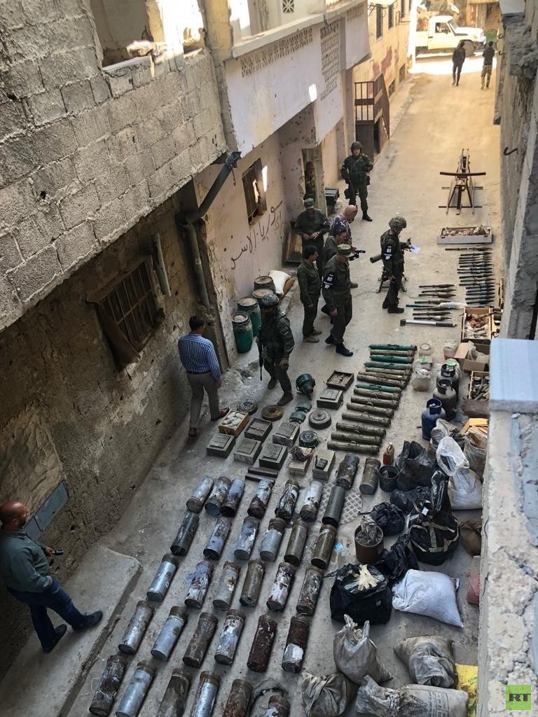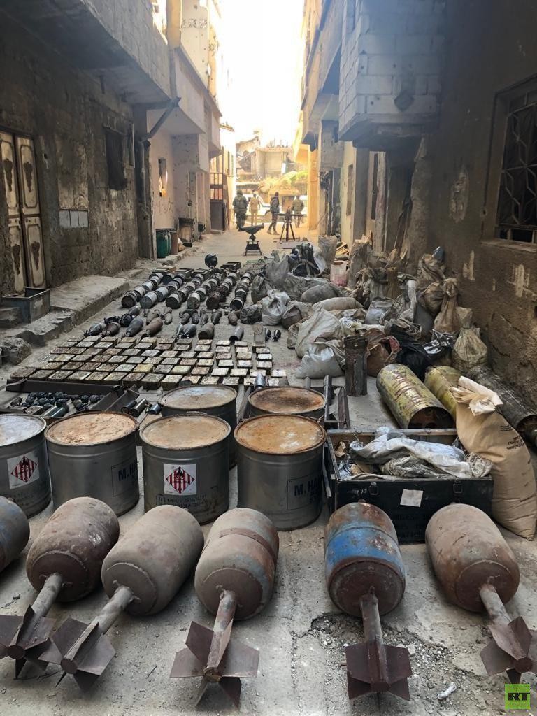 Muraselon dẫn lời phát ngôn viên Quân đội Nga ở Syria cho biết: Lực lượng quân cảnh Nga, trong một cuộc tuần tra thường xuyên ở trại Yarmouk cùng với quân đội Syria, được một người dân địa phương Yarmouk tiếp cận và cung cấp thông tin về một kho vũ khí, cất giấu trong một đường hầm ngầm dưới một ngôi nhà. Với sự hỗ trợ của an ninh quân sự địa phương, quân cảnh Nga đã tìm thấy đường hầm, gỡ bỏ vật cản và vũ khí nổ tự chế và thấy được kho vũ khí.