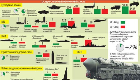 Bộ Quốc phòng Nga trong năm 2015 đã thông qua các biện pháp nhằm bảo đảm toàn diện cho quân đội Nga, nâng cao khả năng sẵn sàng chiến đấu của quân đội, cũng như cải thiện điều kiện xã hội dành cho quân nhân và gia đình họ. Có vị trí quan trọng là việc chuẩn bị kỷ niệm 70 năm Ngày Chiến thắng của nhân dân Liên Xô trong Chiến tranh Vệ quốc vĩ đại.