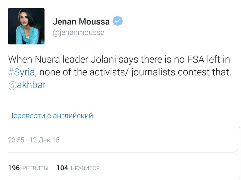 Khi thủ lĩnh của tổ chức khủng bố '' Jabhat al-Nusra '' Abu Muhammad al Dzhulani nói với kênh truyền hình Orient: ở Syria không có '' Quân đội Syria tự do '', không ai trong số các nhà hoạt động / nhà báo đặt ra câu hỏi hoặc phát biểu phản bác tuyên bố này.