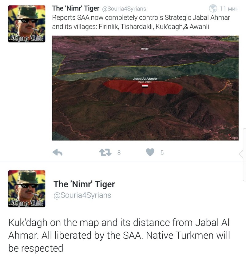 Thị trấn chiến lược quan trọng Jabal Akhdar và một số làng dọc theo biên giới Syria-Thổ Nhĩ Kỳ đã trở về dưới quyền kiểm soát của Quân đội Syria. Các quân nhân quân đội Syria hứa sẽ tôn trọng người dân Turkmen Syria.