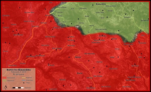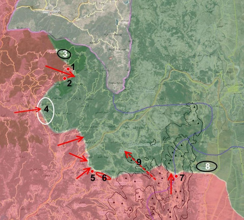 1- Hayat 2 - Al-Sawda. Làng phía nam của Navara (3). Quân đội Syria đánh chiếm một số cao điểm phía đông Rabia (4) Dọc theo đường quốc lộ đánh chiếm làng Ayn al-Zarqa (5) và thung lũng Wadi Zarqa (6). Phía nam Nam của Kabana , quân đội Syria giành được cao điểm 1112 (7). Khu vực Kabana nằm trên sườn núi và khe núi. Nếu không giành được Kabana không thể tấn công vào Sirmaniyu (8). Tiếp cận tuyến chiến đấu đánh vào Kinsibba không có tổn thất binh lực lớn chỉ có thể chỉ thông qua tuyến đường (9). Quân đội Syria phải đánh chiếm các cao điểm khống chế và tốt nhất là có hỏa lực pháo binh bắn dọn đường, chi viện từ những ngọn núi tại Kabana.