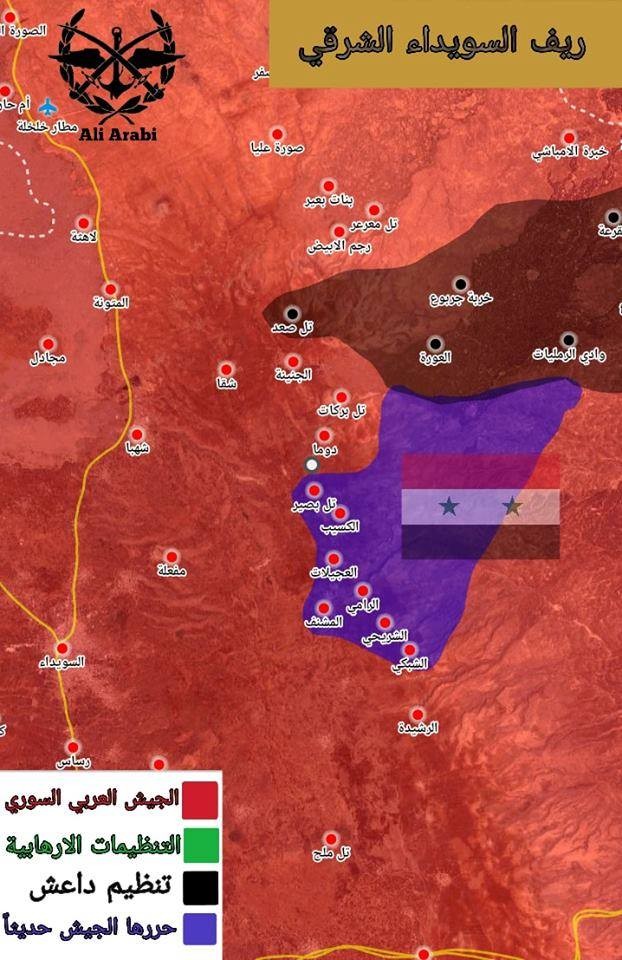 Cuộc tấn công của quân đội Syria trên vùng nông thôn tỉnh Sweida là đòn trả đũa vụ tiến công khủng bố vào thành phố Sweida và các làng mạc thuộc tỉnh, khôi phục lại nhiều địa bàn bị IS chiếm được trong thời gian qua, tiêu diệt 50 tay súng IS. Trong các khu dân cư mà quân đội Syria giải phóng có các làng Rami, Douma, Tima, Matonah và Tarba Kusaib. Đây là những ngôi làng này đã bị IS đánh chiếm trong cuộc tấn công thánh chiến vài giờ trước. Đồng thời quân đội Syria cũng tiến vào sát các địa bàn dân cư Sharihi, Shabki và Gaydat Hamayel.