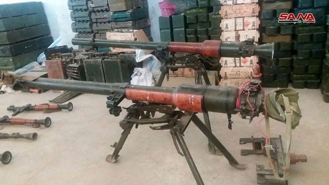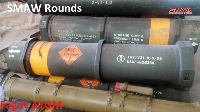Trong kho vũ khí này, quân đội Syria phát hiện một số lượng lớn tên lửa TOW do Mỹ chế tạo, lựu đạn cầm tay có sức nổ mạnh do Israel chế tạo, tổ hợp tên lửa chống tăng có điều khiển Fagot do Pháp sản xuất... Bên cạnh đó còn có các tổ hợp tên lửa chống tăng có điều khiển HJ-73 (ATGM) của Trung Quốc, tổ hợp phóng tên lửa 107mm, hai súng phóng lựu chống tăng SPG -9 73mm, hàng chục súng máy hạng nhẹ và một số kính nhìn đêm, rất nhiều đạn dược, đạn phóng lựu chống tăng và chống bộ binh RPG, đạn cối các loại.