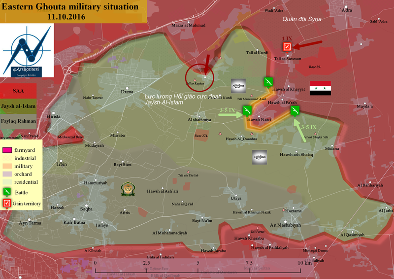 Sáng ngày 11.10.2016, Lữ đoàn 105 Vệ binh Cộng hòa và lực lượng vũ trang địa phương NDF đánh chiếm Nghĩa trang Reyhan, chọc thủng tuyến phòng ngự của Jaysh Al-Islam trước cửa ngõ thị trấn.