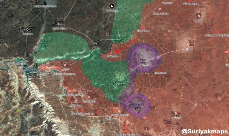 Các đơn vị quân đội Syria, cùng với quân cảnh Nga, sau khi hòa giải đã tiến vào những địa bàn then chốt. Trong đó có thị trấn Tafas, Yadudah, Kafr Shama và một số khu dân cư khác, được đánh dấu bằng màu tím trong bản đồ trên.