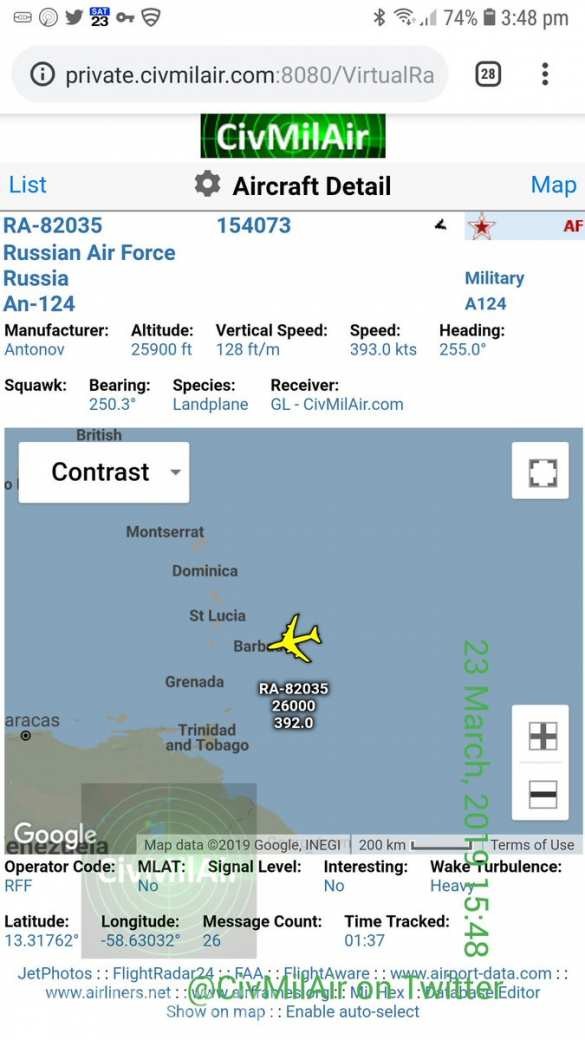 Theo trang web theo dõi máy bay Flightradar24, hai máy bay bao gồm một chiếc hành khách Ilyushin IL-62 và một máy bay vận tải quân sự Antonov AN-124 đến Venezuela từ sân bay quân sự Nga Chkalovsky. Chúng đã nghỉ ngắn để tiếp dầu trên căn cứ không quân Khmeimim, Syria. Trang web theo dõi máy bay Adsbexchange cho biết, chiếc máy bay vận tải đã rời Venezuela chiều ngày 24.03.2019.