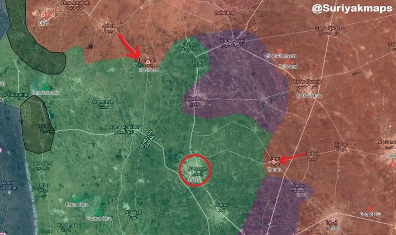 Trong ngày 16.07.2018, trên địa phận tỉnh Daraa và Quneitra, quân đội Syria giải phóng liên tiếp hàng chục khu dân cư như Kafr Shams, Simlin, At Tayhah, Khirbat Mulayah, Aqrabah, Um al-'Awsaj và thị trấn Al-Harra cũng các cao điểm liền kề (Tell al-Harra + Tell al-Ahmar) đại đa số các khu dân cư này đã tham gia vào thỏa thuận với quân đội Syria.