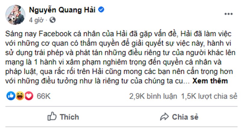 Sau khoảng 1 giờ đồng hồ thì Quang Hải đã đã lấy lại được Facebook và đã lên tiếng về vụ việc này. Tuyển thủ của CLB Hà Nội khẳng định sẽ nhờ cơ quan có thẩm quyền tìm và xử lý kẻ phát tán thông tin trái phép.