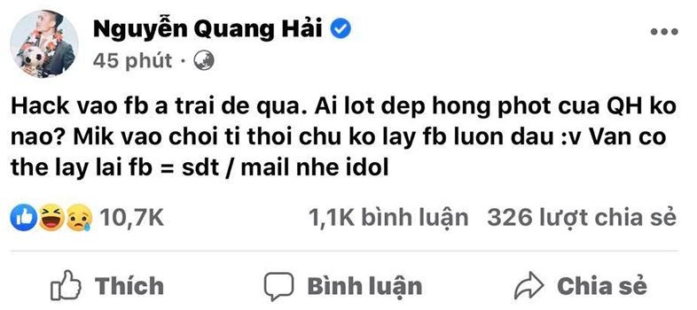Sáng nay, sau khi tấn công và chiếm giữ được Facebook của Quang Hải, hacker đã để lại thông điệp: “Hack vào Facebook anh trai dễ quá. Ai lót dép hóng phốt của Quang Hải không nào? Mình vào chơi tí thôi chứ không lấy Facebook luôn đâu…”.