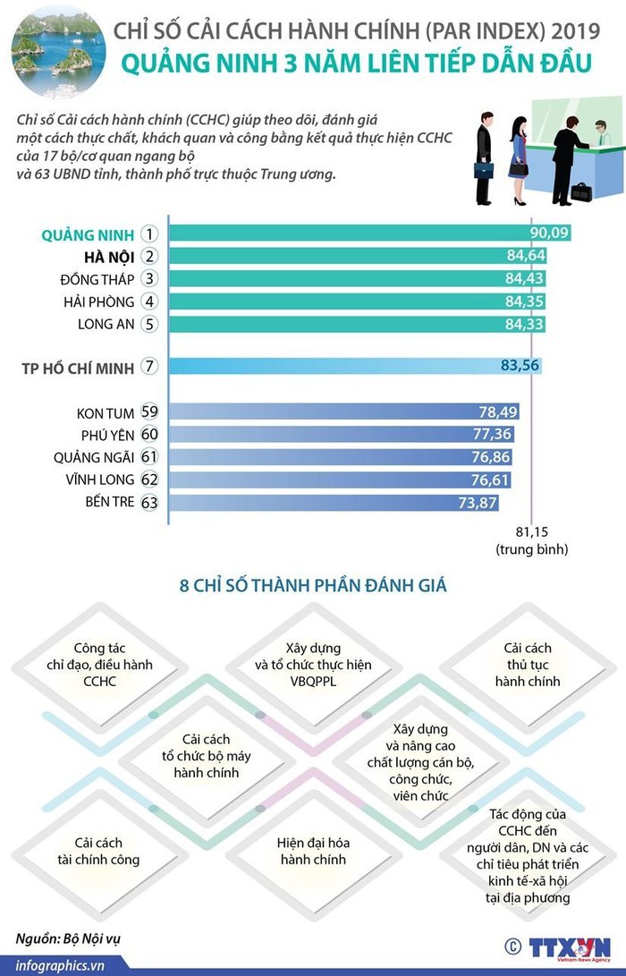 Về Chỉ số hài lòng của người dân, tổ chức đối với sự phục vụ của cơ quan hành chính Nhà nước năm 2019 (Chỉ số SIPAS 2019), 3 tỉnh đứng đầu là , Hải Phòng, Cà Mau; 3 tỉnh có chỉ số hài lòng thấp nhất là Bình Thuận, Đắk Lắk, Cao Bằng./.