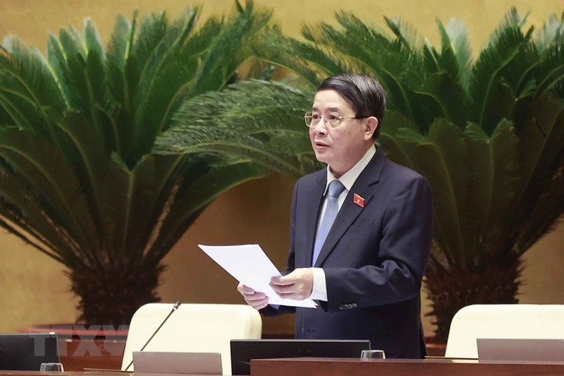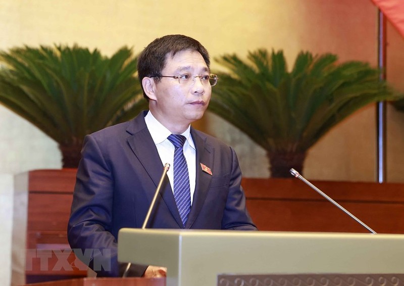 Chủ nhiệm Ủy ban Kinh tế của Quốc hội Vũ Hồng Thanh báo cáo thẩm tra việc thu hồi đất, bồi thường, hỗ trợ, tái định cư Cảng Hàng không Quốc tế Long Thành. (Ảnh: Doãn Tấn/TTXVN)