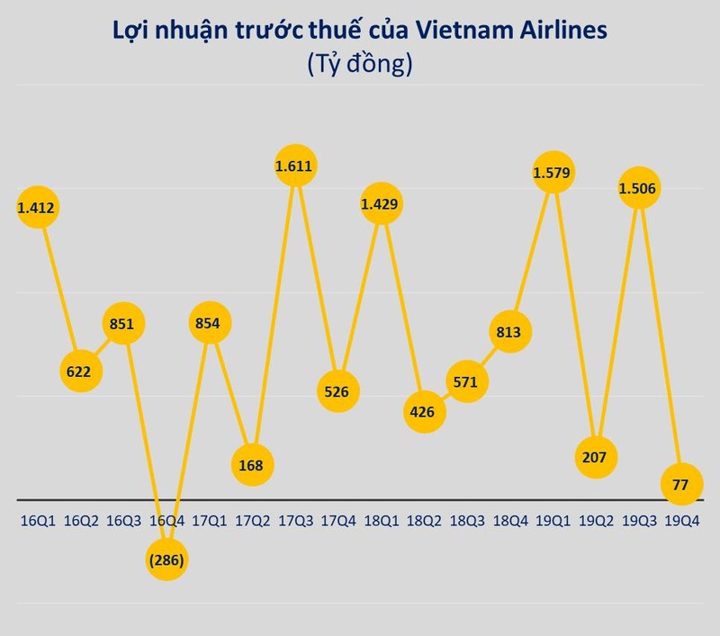 Với tính mùa vụ của ngành hàng không, quý IV/2019 tiếp tục là một quý cuối năm kém hiệu của HVN. Thậm chí, đây còn là quý kinh doanh kém hiệu quả nhất kể từ năm 2017 đến nay của Vietnam Airlines. Trừ quý IV/2016 bị lỗ 286 tỷ đồng thì 4 năm nay, chưa quý nào mà HVN lại lãi thấp đến vậy.