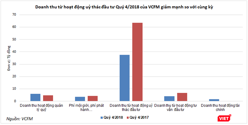 Trong đó, nguyên nhân chủ yếu là do số lượng và giá trị các hợp đồng ủy thác trong kỳ của các nhà đầu tư tổ chức, cá nhân giảm mạnh. Điều này khiến cho nguồn doanh thu từ hoạt động ủy thác đầu tư, vốn chiếm tỷ trọng lớn trong cơ cấu doanh thu của VCFM, chỉ đạt 37,5 tỷ đồng, giảm tới 41% so với Quý 4/2017.