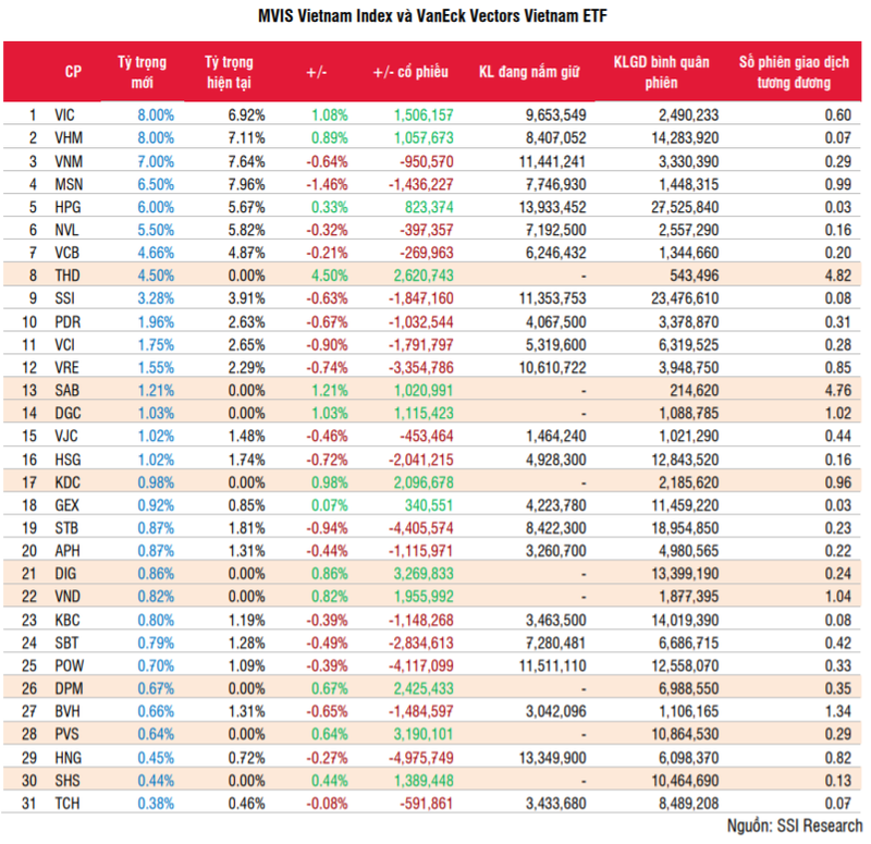 Danh mục MVIS Vietnam Index sẽ bao gồm 46 cổ phiếu, trong đó có 31 cổ phiếu niêm yết tại Việt Nam và 15 cổ phiếu nước ngoài có liên quan. Bên cạnh các cổ phiếu được thêm mới, theo SSI, quỹ VNM ETF sẽ tăng sở hữu VIC, VHM và HPG trong khi giảm sở hữu ở phần lớn các cổ phiếu còn lại. Tổng tỷ trọng các cổ phiếu Việt Nam ước tính sẽ tăng từ 64,7% lên 66,6%, tương đương giá trị mua ròng 10,9 triệu USD.