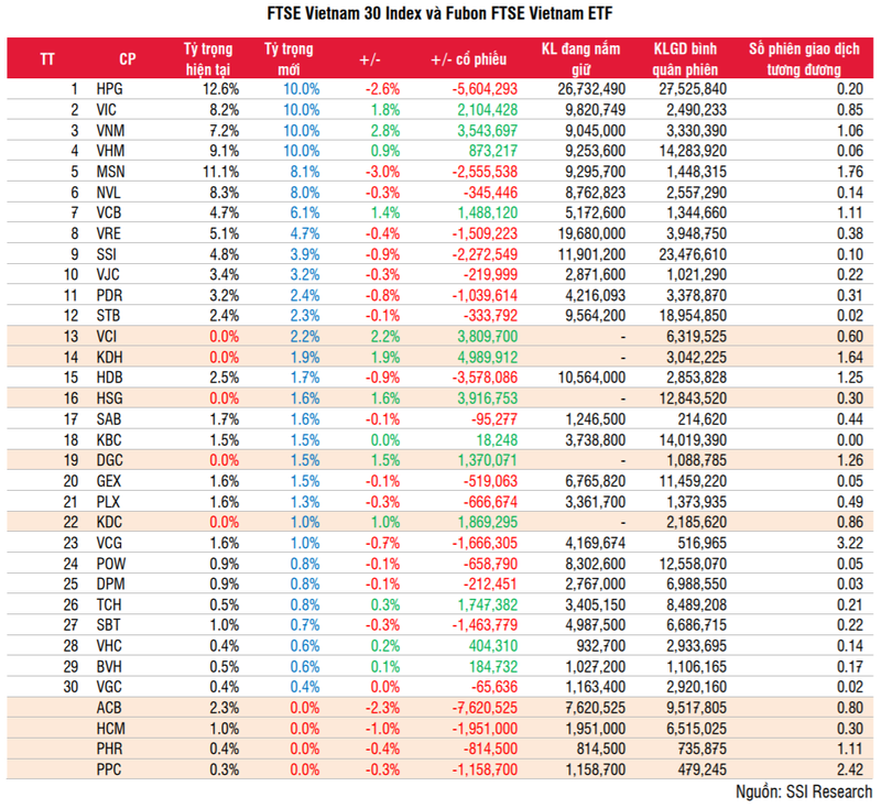 Mặc dù FTSE Russel không công bố danh mục chi tiết của chỉ số FTSE Vietnam 30 Index, song dựa trên số liệu chốt ngày 20/8, SSI dự báo các cổ phiếu như KDH, VCI, HSG, DGC và KDC có thể được thêm vào chỉ số nhờ đạt các điều kiện yêu cầu về vốn hóa và thanh khoản. Ngược lại, quỹ sẽ loại bỏ ACB, HCM do điều chỉnh giảm khối lượng mà nhà đầu tư nước ngoài có thể mua và PHR, PPC do không đủ điều kiện về vốn hóa.