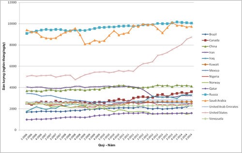 Biểu đồ sản lượng khai thác dầu mỏ và condensate của 15 quốc gia