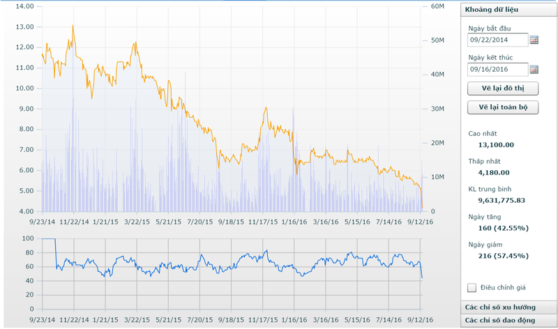 Trước đó, mã cổ phiếu này đã rơi vào thời kỳ suy thoái trầm trọng, rơi một mạch từ mức 8 nghìn đồng/cổ phiếu vào đầu năm 2016 về mức hơn 4 nghìn đồng/cổ phiếu như hiện nay.