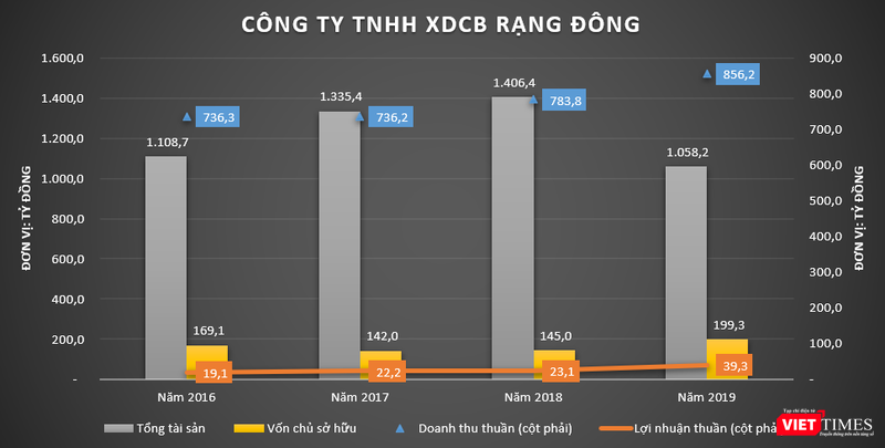 Cụ thể, Công ty TNHH XDCB Rạng Đông tính đến cuối năm ngoái có quy mô tổng tài sản đạt mức 1.058,22 tỷ đồng. Trong 4 năm gần đây, công ty này vẫn đều đặn báo lãi cả chục tỷ đồng mỗi năm.