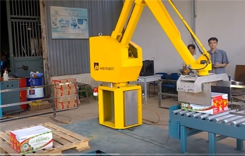 Cũng theo đại diện công ty AKB Machinery, sản phẩm hoàn chỉnh của giải pháp này được đặt tên là AKB-APRV2 và về định nghĩa thì đây là mẫu robot công nghiệp cỡ lớn, dùng để bốc xếp thùng ,bao hoặc gạch có trọng lượng đến 50kg từ hệ thống băng tải đầu ra dây chuyền sản xuất rồi xếp lên pallet theo các vị trí đã được lập trình trước. Robot này có độ chính xác cao và tiêu thụ điện năng cực thấp (công suất 1,2KW).