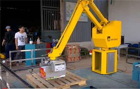 Thạc sỹ Nguyễn Hồng Phúc, chủ nhiệm đề tài cho biết, mục tiêu đề tài được nhóm đặt ra là thực hiện các nội dung nghiên cứu thiết kế AKB Pallettizer Robot - AKB-APRV2 để bốc xếp thùng, bao từ băng tải lối ra dây chuyền sản xuất lên pallet.