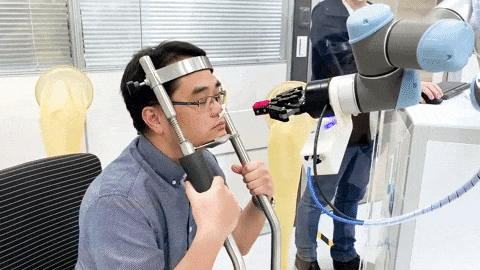 Sau đó, robot sẽ dùng cảm biến độ sâu để quét khuôn mặt của người xét nghiệm. Từ kết quả thu được, robot sẽ tính toán độ sâu của khoang mũi, khoảng cách từ lỗ mũi tới ống tai để đẩy que xét nghiệm vào đúng vị trí cần lấy mẫu.
