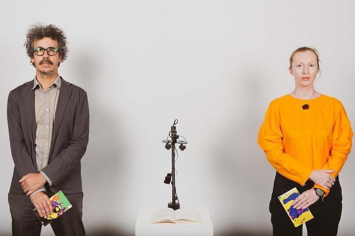 Cỗ máy đọc sách sử dụng AI, của Tiến sĩ Andy Simionato (trái) và Tiến sĩ Karen ann Donnachie (phải), biến tiểu thuyết thành thơ Haiku. Ảnh: Peter Clarke.