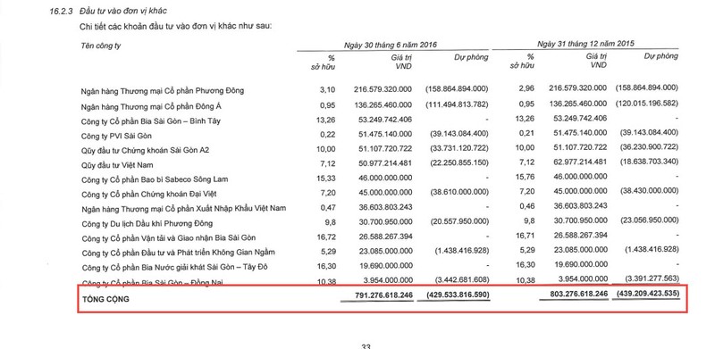 Cụ thể, Sabeco đã đầu tư vào đơn vị như: 216 tỷ đồng tại Ngân hàng TMCP Phương Đông (OCB) trích lập dự phòng 159 tỷ đồng, chiếm 73% số tiền đầu tư; 136 tỷ đồng tại Ngân hàng TMCP Đông Á (DongA Bank), trích lập dự phòng 111 tỷ đồng, chiếm 81,6% số tiền đầu tư; 51 tỷ đồng tại Quỹ đầu tư Chứng khoán Sài Gòn A2, số tiền trích lập dự phòng là 22 tỷ đồng; 36,6 tỷ đồng tại Ngân hàng TMCP XNK Việt Nam; chưa kể Sabeco đầu tư 45 tỷ đồng tại CTCP Chứng khoán Đại Việt thì số tiền trích lập lên tới 38,6 tỷ đồng, tương đương với 86% tổng số tiền đầu tư.