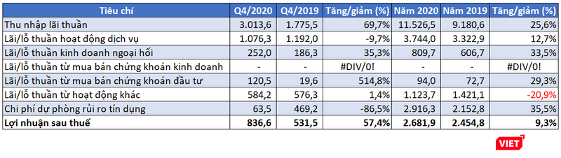 Theo đó, trong quý cuối năm 2020, nhà băng này báo lãi trước và sau thuế lần lượt là 1.013,5 tỉ đồng và 836,6 tỉ đồng, tăng 39,6% và 57,4% so với cùng kỳ năm 2019.