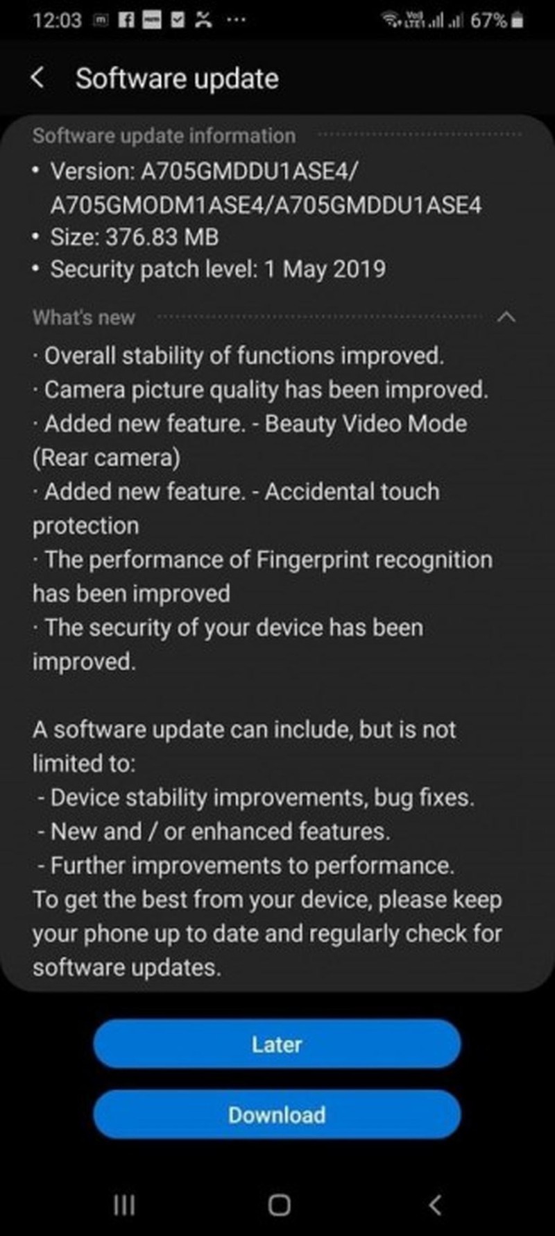 Bản cập nhật A705GMDDU1ASE4 có dung lượng 376MB với những cải tiến về camera, nhận diện vân tay và độ ổn định cao.
