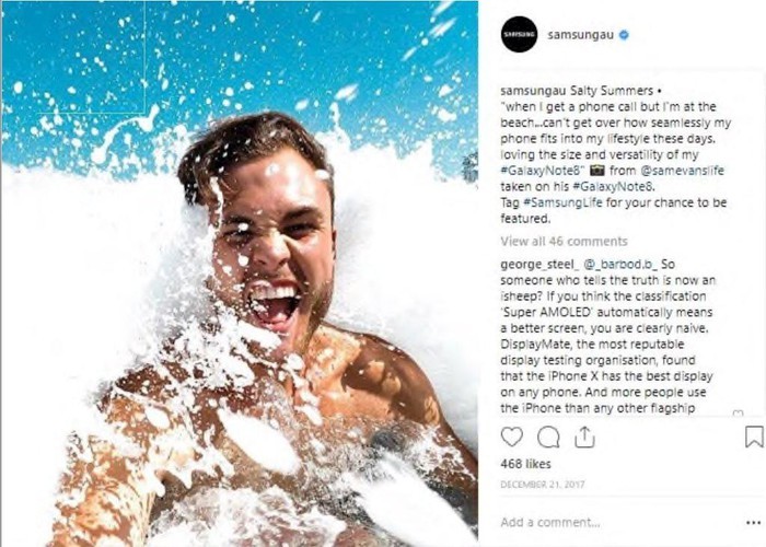 Một quảng cáo của Samsung trên Instagram nhắc đến việc sử dụng Note 8 trên biển