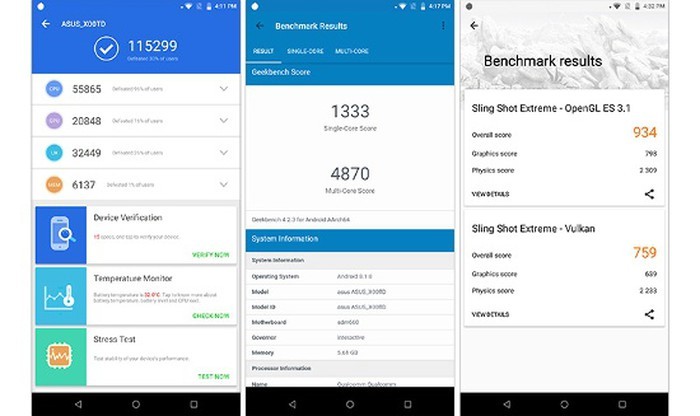 Để có được đánh giá chính xác hơn về hiệu năng của bộ vi xử lý, trước tiên chạy kiểm tra các bài benchmark thông thường trên thiết bị, bao gồm AnTuTu, Geekbench 4 và 3DMark.