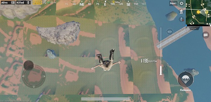 Trên hết, do RAM 4GB hạn chế của Galaxy A7 2018 mất quá nhiều thời gian để tải các chi tiết đồ họa của bản đồ, khi nhảy ra khỏi máy bay chúng ta chỉ có thể nhìn thấy những đốm màu sắc khác nhau trên nền đất, chỉ nhìn rõ khi hạ cánh.