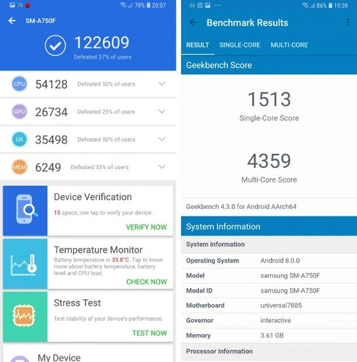 Kiểm tra cho thấy, điểm số mà Galaxy A7 2018 ghi được khá phù hợp với những gì người dùng có thể mong đợi từ một thiết bị trong phân khúc giá. Máy ghi được 122.609 điểm trên AnTuTu.