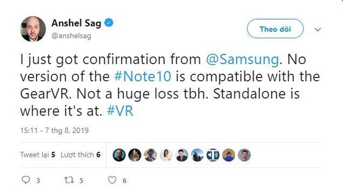 Ngay sau khi ra mắt chiếc Galaxy Note 10, Samsung cũng đã đưa ra thông tin chiếc smartphone này sẽ không tương thích với bộ Gear VR, một bộ headset thực tế ảo của Samsung chỉ hoạt động khi đặt một chiếc smartphone vào phía trước phần ống kính. Thông tin này được xác nhận theo một đoạn tweet của nhà phân tích công nghệ Anshel Sag. Quyết định dừng việc hỗ trợ kết nối với bộ headset của chiếc điện thoại flagship mới và Gear VR, hai sản phẩm đều của Samsung đã tạo nên nhiều hoài nghi về tương lai của thiết bị VR kết nối với smartphone này. Đồng thời các thiết bị VR độc lập với màn hình lắp đặt sẵn như Oculus Go đang trên đà phát triển mạnh mẽ.