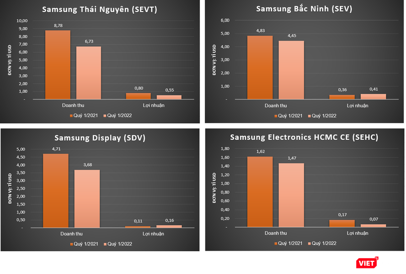 Samsung Bắc Ninh ghi nhận doanh thu quý 1/2022 đạt 4,8 tỉ USD, tăng 8,7% so với quý 1/2021. Tuy nhiên, đơn vị này lại báo lãi giảm 12,9% so với cùng kỳ năm trước, xuống mức 0,3 tỉ USD.