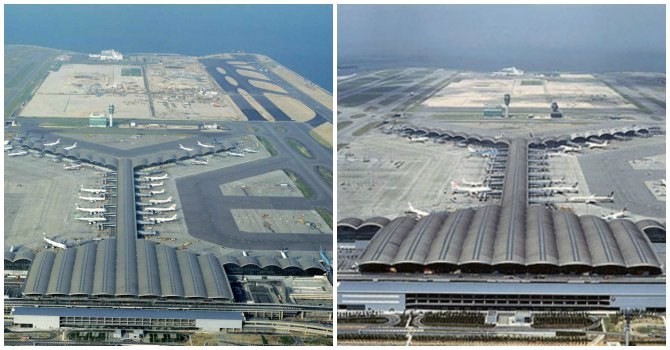 Phối cảnh sân bay Chek Lap Kok (trái) và phối cảnh sân bay Long Thành (phải)
