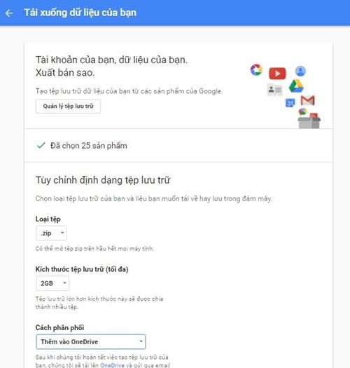 Ở giao diện kế tiếp, người dùng cần lựa chọn định dạng lưu trữ (.zip, .tgz và .tbz), dung lượng tập tin tối đa (nếu dữ liệu vượt mức cho phép, tập tin sẽ được tự động chia nhỏ) và nơi lưu trữ dữ liệu. Mặc định, sau khi sao lưu dữ liệu hoàn tất, Google sẽ gửi liên kết tải xuống thông qua email hoặc đẩy lên Google Drive, Dropbox và OneDrive.