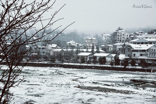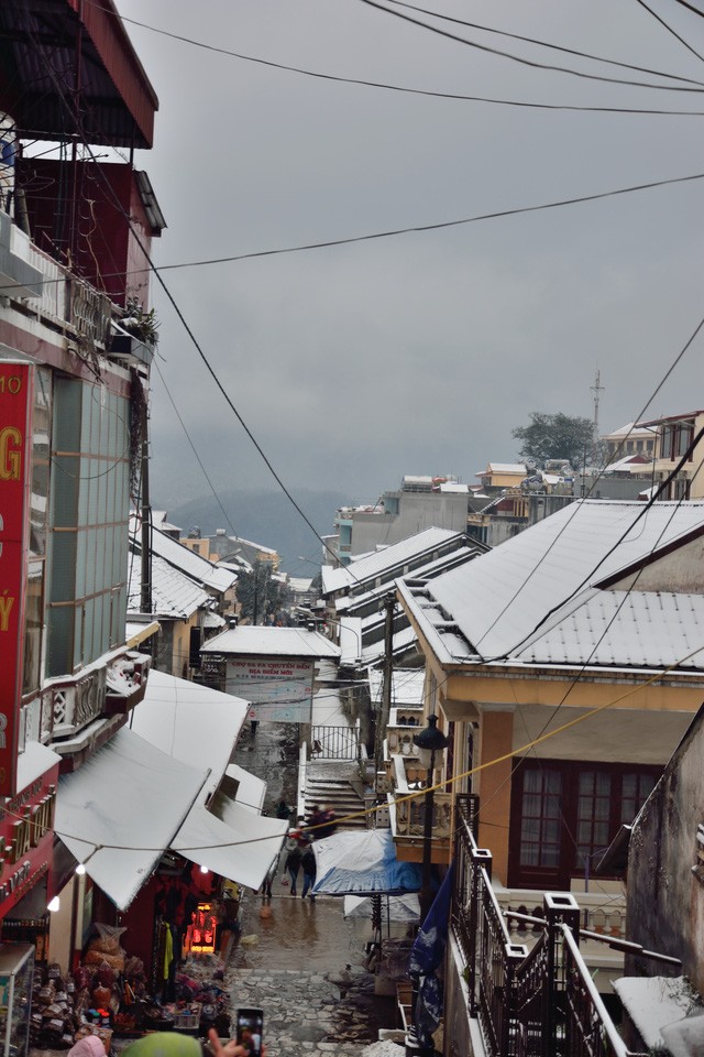 Những con đường, góc phố, nhà cao tầng và toàn bộ quang cảnh bị tuyết trắng dày đặc bao trùm, đây là quang cảnh của thị trấn Sapa những ngày này.