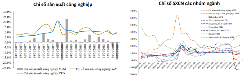 Trong tháng 2/2019, chỉ số sản xuất công nghiệp (SXCN) đã giảm mạnh 17% so với tháng trước. Lũy kế 2 tháng đầu năm nay, chỉ số SXCN chỉ tăng 9,2%, thấp hơn đáng kể so với mức tăng 15% của cùng kỳ năm 2018.