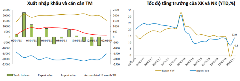 Cụ thể, cả xuất khẩu và nhập khẩu trong tháng 2 đều có xu hướng giảm mạnh, hơn 20%, so với tháng 1/2019. Lũy kế 2 tháng đầu năm, hoạt động xuất khẩu có mức tăng thấp hơn so với nhập khẩu. So với cùng kỳ năm ngoái, cả hai hoạt động này đều có mức tăng thấp hơn rất nhiều (cùng kỳ năm 2018 xuất khẩu tăng 23% trong khi nhập khẩu tăng 18%).