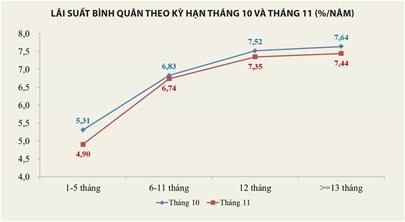 Với những diễn biến trái chiều như trên, lãi suất bình quân kỳ hạn từ 6-11 tháng chỉ giảm nhẹ 0,09 điểm phần trăm so với tháng 10, xuống còn 6,74%. Theo đó chênh lệch giữa hai khung kỳ hạn 6-11 tháng và 1-5 tháng mở rộng từ 1,52 điểm phần trăm lên 1,84 điểm phần trăm, tức tăng thêm 0,32 điểm phần trăm. Điều này được cho là sẽ giúp dòng tiền gửi khách hàng có thể chuyển dịch từ kỳ hạn ngắn dưới sáu tháng sang kỳ hạn dài hơn trên sáu tháng.