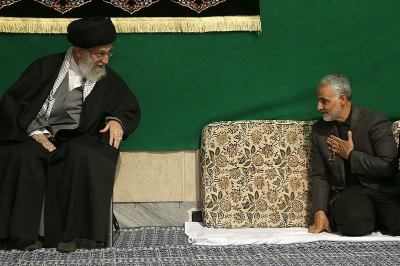 Ông Qasem Suleimani là người giữ vai trò then chốt trong chiến lược Trung Đông của Iran và mối quan hệ của ông với các quan chức cấp cao đã quyết định việc ông đóng vai trò quan trọng trong các quyết sách đối ngoại của Iran. Lữ đoàn tinh nhuệ Quds được báo cáo trực tiếp với lãnh tụ tối cao của Iran. Ông Qasem Sulaymani duy trì mối quan hệ chặt chẽ với Lãnh đạo tối cao của Iran Grand Ayatollah Seyyed Ali Khamenei. Có cơ quan truyền thông cho rằng ông là “một người cực kỳ quan trọng và có ảnh hưởng mạnh mẽ”. Trong ảnh trên: ngày 27/3/2015, ông Qasem Suleimani thực hiện nghi thức gặp mặt báo cáo Lãnh tụ tối cao Khamenei. (Ảnh: AFP).