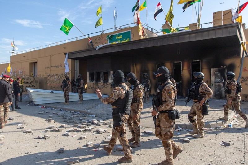 Sau khi Đại sứ quán Hoa Kỳ tại Baghdad của Iraq bị tấn công bạo lực vào ngày 31/12/2019, ngày 1/1/2020 lại nổ ra các cuộc biểu tình phản kháng Mỹ của dân chúng. Nguyên nhân gây ra tình hình căng thẳng đột ngột ở Trung Đông được cho là bắt nguồn từ lực lượng dân quân Iraq “Lữ đoàn Thánh Allah” thân Iran tấn công căn cứ quân sự của Iraq vào ngày 27/12/2019, gây ra cái chết của một người Mỹ. Ngày 29/12.Mỹ đã phát động một chiến dịch quy mô lớn, không kích các vị trí của “Lữ đoàn Allah” ở Iraq và Syria, giết chết ít nhất 25 người. Vụ việc đã làm dấy lên sự phẫn nộ của người Iraq. Một số lượng lớn người dân Iraq thân Iran đã kéo đến Đại sứ quán Mỹ ở Baghdad để phản đối và tấn công vào bên trong. (Ảnh: AP).