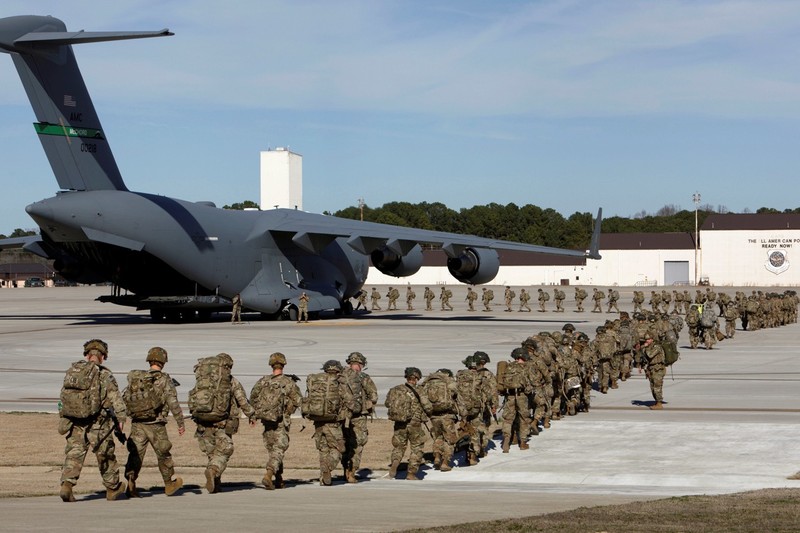 Sau đó, Bộ trưởng Quốc phòng Hoa Kỳ Mark Esper đã đưa ra một tuyên bố rằng do xảy ra các hoạt động chống lại Đại sứ quán Hoa Kỳ tại Iraq ở thủ đô Baghdad, quân đội Hoa Kỳ đã phái lực lượng đặc biệt tới để bảo vệ an ninh cho Đại sứ quán. Trong ảnh trên: ngày 1 tháng 1, lính dù phản ứng nhanh của Sư đoàn Đổ bộ đường không số 82 đang hành quân lên máy bay vận tải C-17 để tới Kuwait. (Ảnh: Reuters)
