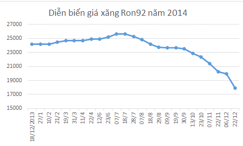 | 12 lần giảm giá xăng trong năm 2014: -Ngày 28/7, xăng lần đầu tiên giảm giá trong năm với mức 330-350 đồng/lít. Trong đó, xăng RON 92 giảm 330 đồng /lít từ 25.640 đồng/lít còn 25.310 đồng/lít. -Ngày 7/8, xăng giảm 500 đồng/lít. Xăng RON 92 giảm từ 25.310 đồng/lít còn 24.810 đồng/lít. -Ngày 18/8, xăng giảm giá 600 đồng/lít về mức 24.210 đồng/lít với xăng RON 92. -Ngày 29/8, xăng giảm 470 đồng/lít còn 23.740 đồng/lít với xăng RON 92 -Ngày 9/9, xăng tiếp tục giảm 30 đồng lít về mức 23.710 đồng/lít với xăng RON 92. -Ngày 30/9, xăng RON 92 và 95 giảm nhẹ 150 đồng/lít về mức 23.560 đồng/lít (RON 92) và 24.160 đồng/lít (RON 95) -Ngày 13/10, xăng giảm 670 đồng xuống còn 22.890 đồng/lít (RON 92) và 23.490 đồng/lít(RON 95) -Ngày 23/10, giá xăng tiếp tục giảm 550 đồng/lít, từ mức 22.890 đồng/lít xuống chỉ còn 22.340 đồng/lít (RON 92) -Ngày 7/11, xăng giảm thêm 950 đồng/lít còn 21.390 đồng/lít với xăng RON 92 -Ngày 22/11, xăng RON 95 và RON 92 cùng giảm mạnh 1.140 đồng/lít, về mức 20.850 đồng/lít (RON 95) và 20.250 đồng/lít (RON 92). -Ngày 6/12, giá xăng giảm thêm 320 đồng/lít xuống dưới mức 20.000 đồng/lít. Cụ thể RON 92 còn 19.930 đồng/lít, xăng RON 95 còn 20.530 đồng/lít. -Ngày 22/12, xăng giảm mức kỷ lục với 2.050 đồng/lít và đưa mức giá bán lẻ xăng RON 92 trên thị trường xuống còn 17.880 đồng/lít, RON 95 còn 18.480 đồng/lít. |
