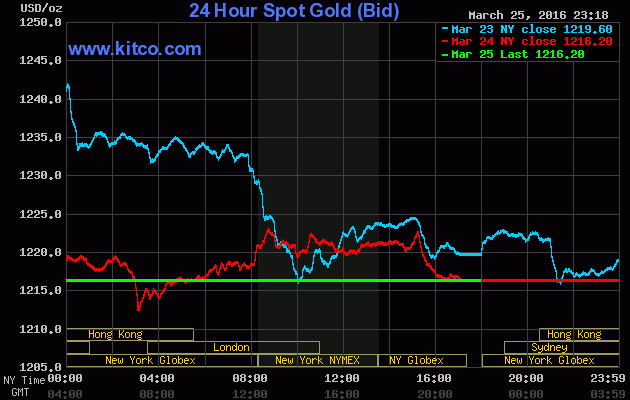 Thị trường Bắc Mỹ sớm đóng cửa giao dịch vào ngày thứ Sáu để bước vào kỳ nghỉ lễ Tạ ơn. Trước đó, chốt phiên giao dịch Thứ Năm (ngày 24/03), giá vàng giao tháng Tư trên sàn Comex tại Sở giao dịch New York Mercantile nối đà trôi nhẹ $2,40 (-0,2%) xuống đóng cửa ở $1.221,60/oz, thấp nhất kể từ cuối tháng Hai; và tính chung từ đầu tuần, giá vàng giảm 2,6%, đánh dấu tuần giảm thứ ba liên tiếp.